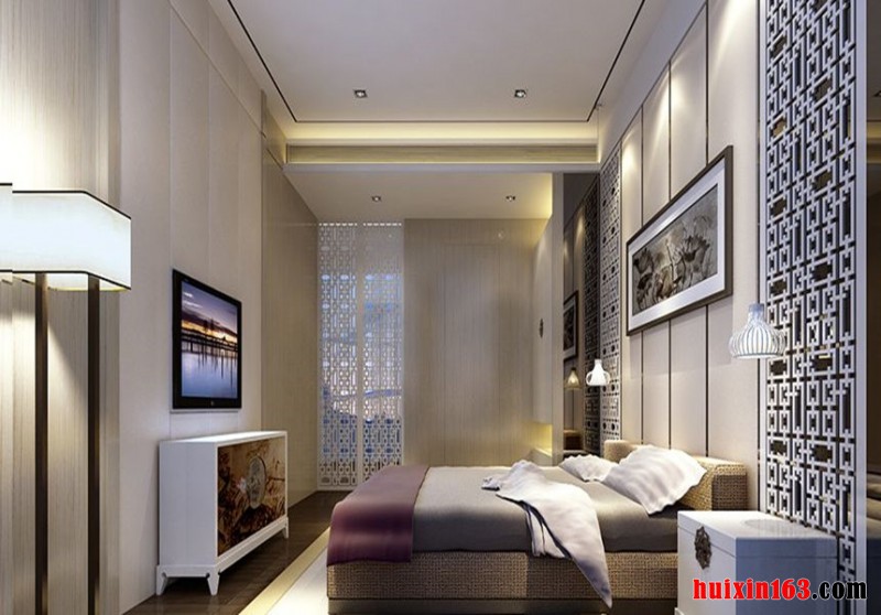 卧室家具是运用了清式的红木家具,顶面采用了木线、角花跟木花格作为装饰。直线装饰在空间的使用,不仅反映出现代人对追求简单生活的居住要求,更迎合了古典家具追求内敛、质朴的设计风格,使整套设计更加实用、更富传统韵味,散发出一种浓郁的古典气息。