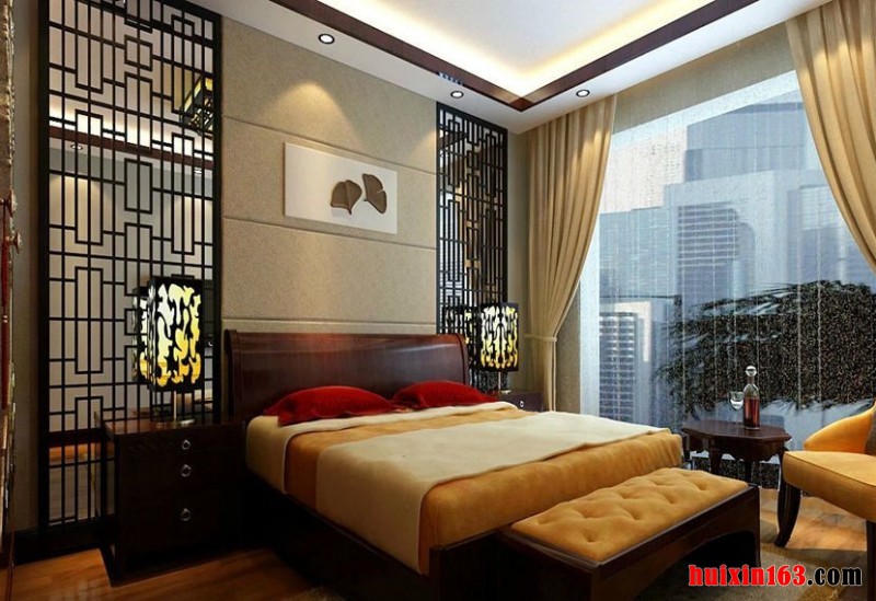 卧室家具是运用了清式的红木家具,顶面采用了木线、角花跟木花格作为装饰。直线装饰在空间的使用,不仅反映出现代人对追求简单生活的居住要求,更迎合了古典家具追求内敛、质朴的设计风格,使整套设计更加实用、更富传统韵味,散发出一种浓郁的古典气息。