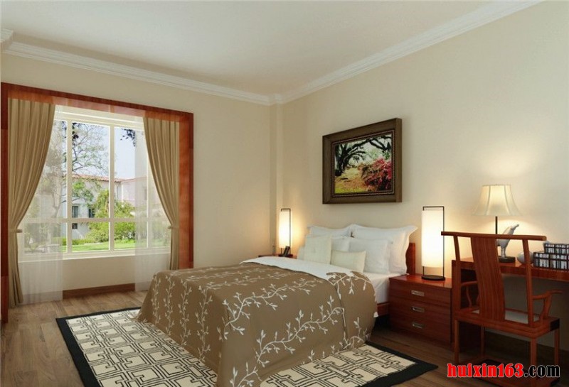 卧室家具是运用了清式的红木家具,顶面采用了木线、角花跟木花格作为装饰。直线装饰在空间的使用,不仅反映出现代人对追求简单生活的居住要求,更迎合了古典家具追求内敛、质朴的设计风格,使整套设计更加实用、更富传统韵味,散发出一种浓郁的古典气息。