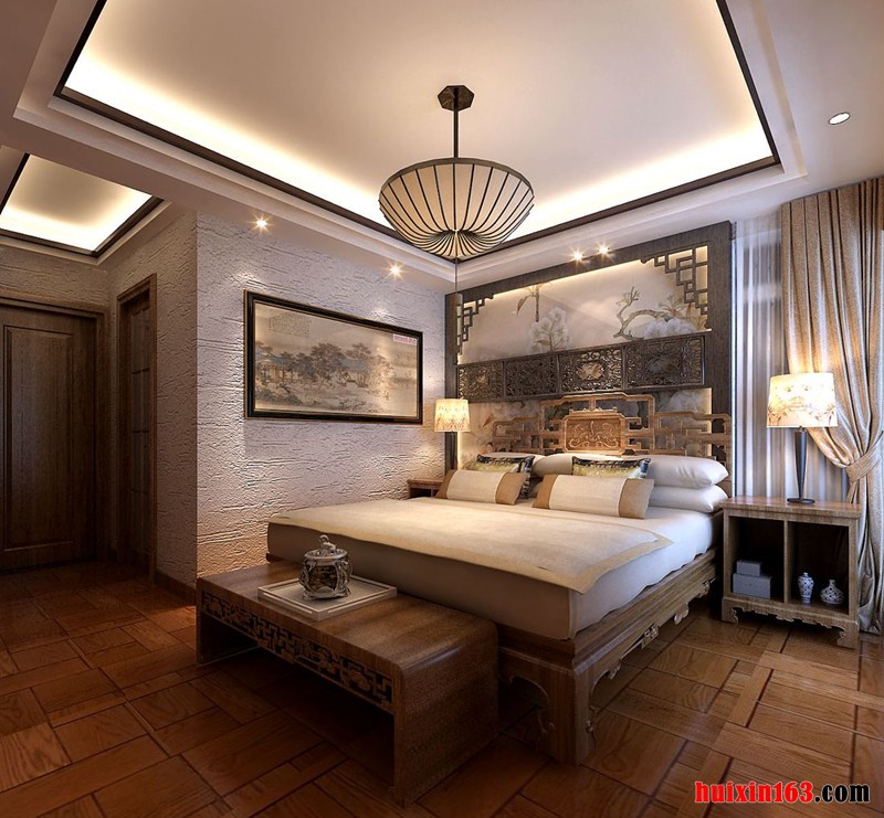 卧室简练到极致的建筑元素,将中国气息的人文情怀纳入园内。以古典风格设计,使用原木、石材、风景画、古典线条等勾勒古典古韵的人文雅居。以简约的手笔,融合东方的审美传统,西方现代的精神。呈现了贯穿中西,融古汇今的一个作品,演绎了富有大宅气派的品味家居生活。