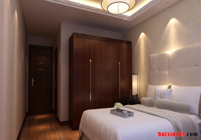 卧室造型上,采用的是硬朗的直线条,并以对称的方式呈现,表现了端庄大气的视觉效果,在色彩上,以原木色、浅棕色为基础色调,凸显了温馨静雅的中式家居特点,仿古地砖和实木复合地板等,将古典元素与现代材质融为一体,在家具配置上,选用了稳重大方的一品榆系列家具,端庄的造型,精致的细节雕刻,演绎了丰富的艺术灵感和独特的人文内涵。