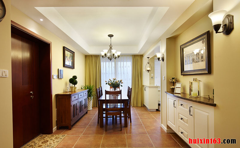 本套餐厅装饰中空间内的装饰色调主要是以白色为主,搭配上水晶吊灯的照射可以是整个空间都显得十分明亮,地面上的拼花地砖更是彰显出了一种高贵与唯美,更加凸显出了美式风格的魅力。