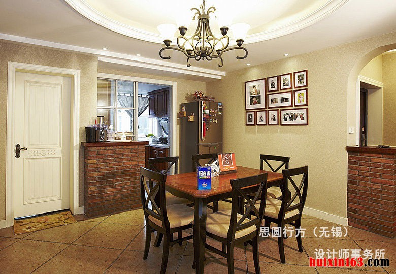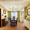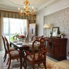 本套餐厅装饰中空间内的装饰色调主要是以白色为主,搭配上水晶吊灯的照射可以是整个空间都显得十分明亮,地面上的拼花地砖更是彰显出了一种高贵与唯美,更加凸显出了美式风格的魅力。