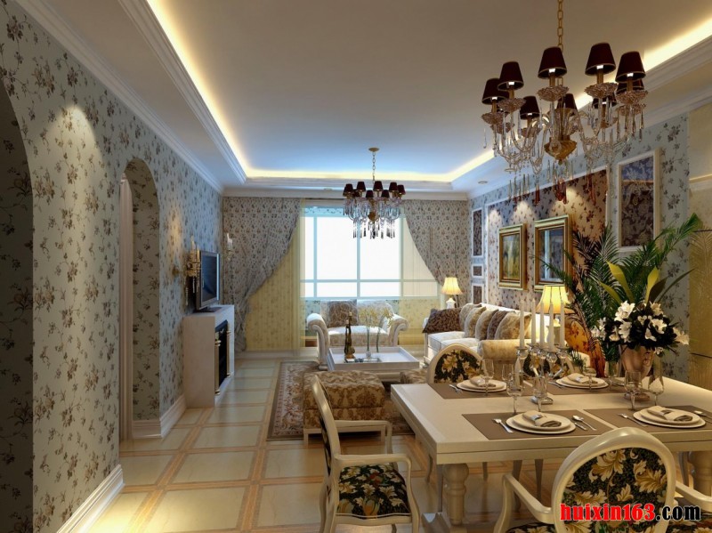 本套餐厅装饰中空间内的装饰色调主要是以白色为主,搭配上水晶吊灯的照射可以是整个空间都显得十分明亮,地面上的拼花地砖更是彰显出了一种高贵与唯美,更加凸显出了美式风格的魅力。