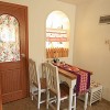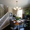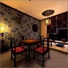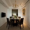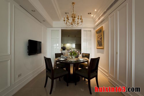 本套餐厅的整体装饰效果可以带给人们一种大气感,石膏板吊顶采用了平顶式的设计,可以将中间的金属吊灯衬托的更加精美,同时也富有一定的时尚气息,更是将下方的黑色实木餐桌照射的更加高贵、典雅。