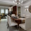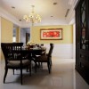 本套餐厅的整体装饰效果可以带给人们一种大气感,石膏板吊顶采用了平顶式的设计,可以将中间的金属吊灯衬托的更加精美,同时也富有一定的时尚气息,更是将下方的黑色实木餐桌照射的更加高贵、典雅。